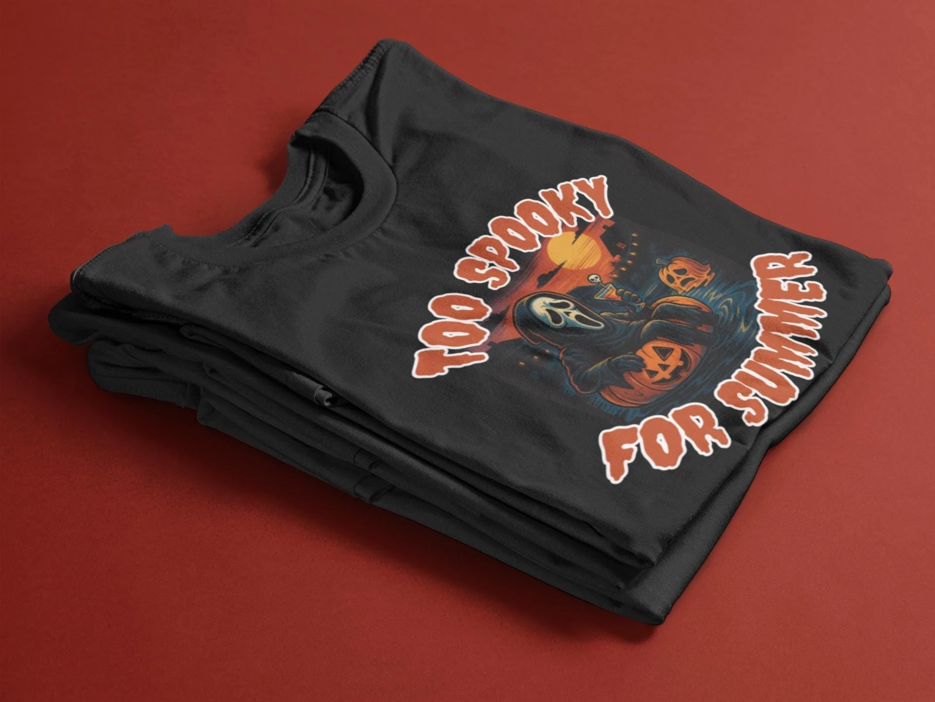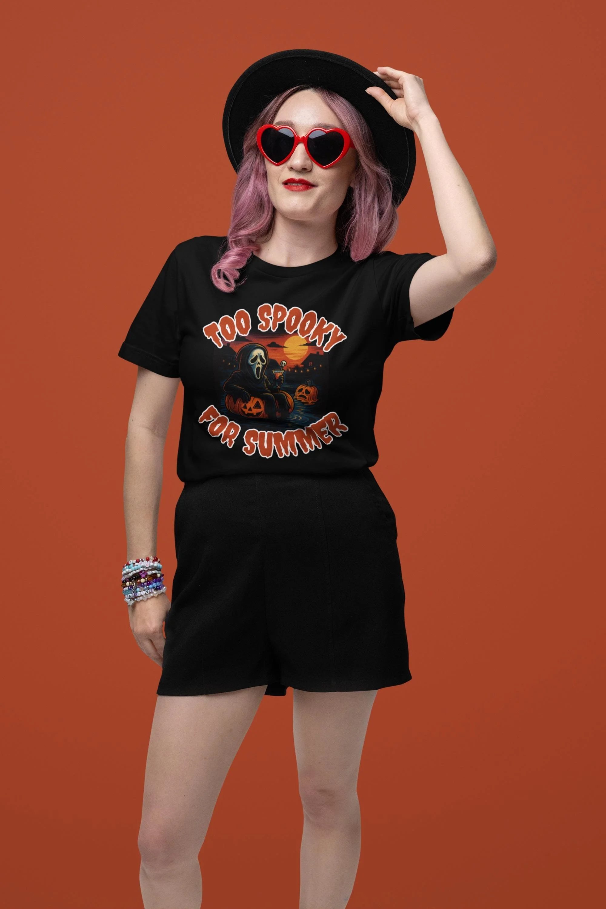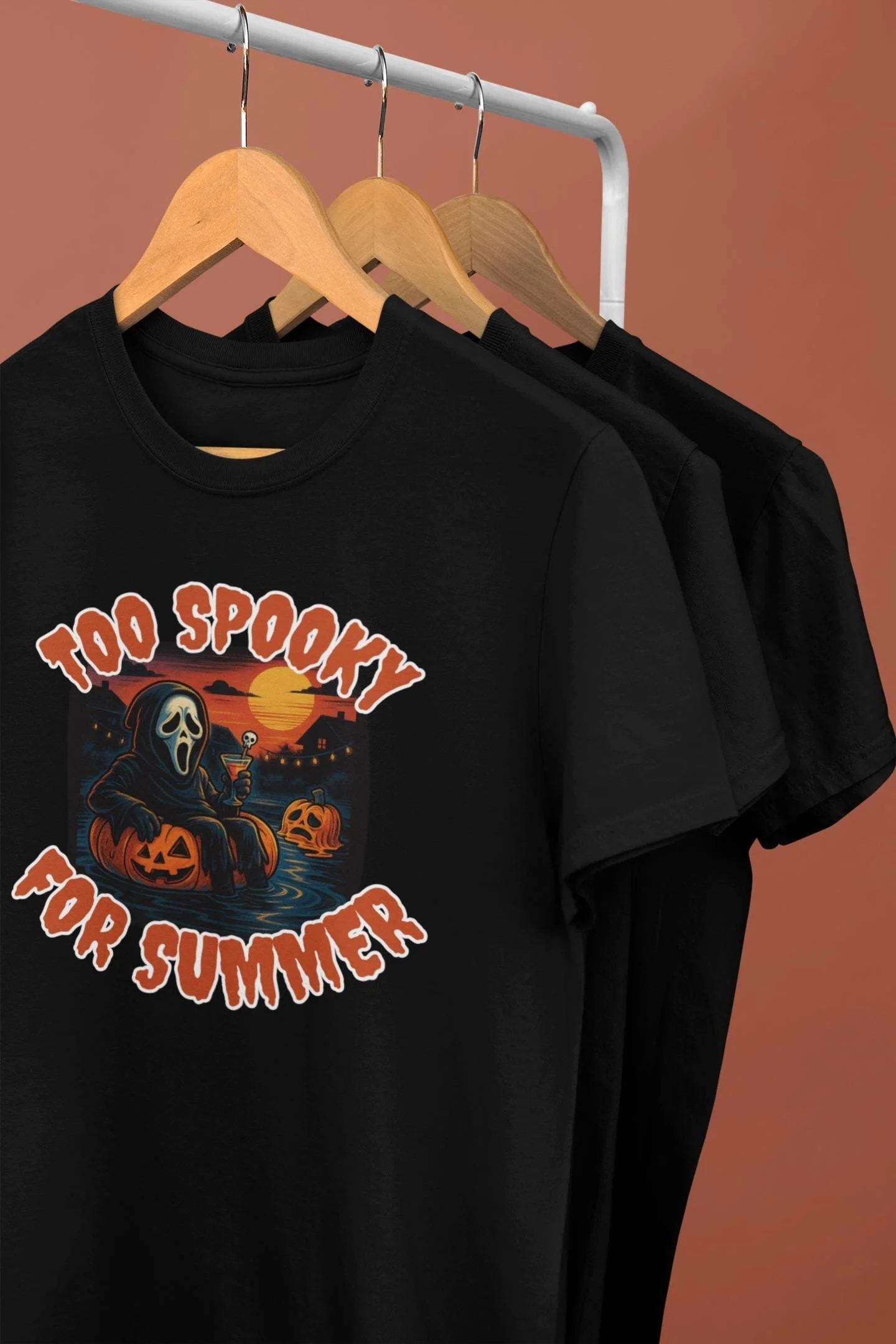 Printed on a comfy black or white tee, this one’s perfect for spooky season lovers, horror movie addicts, and anyone who thinks a pool day would be better with some string lights and a melting pumpkin.