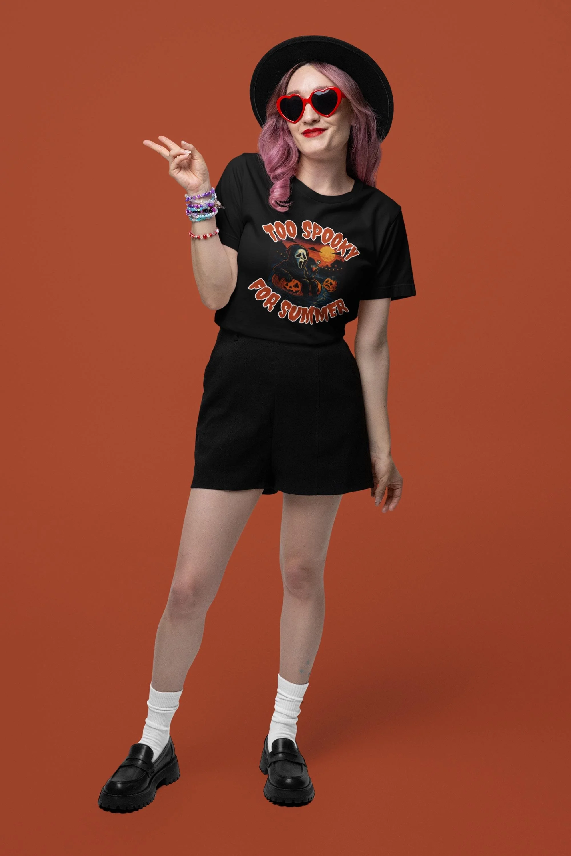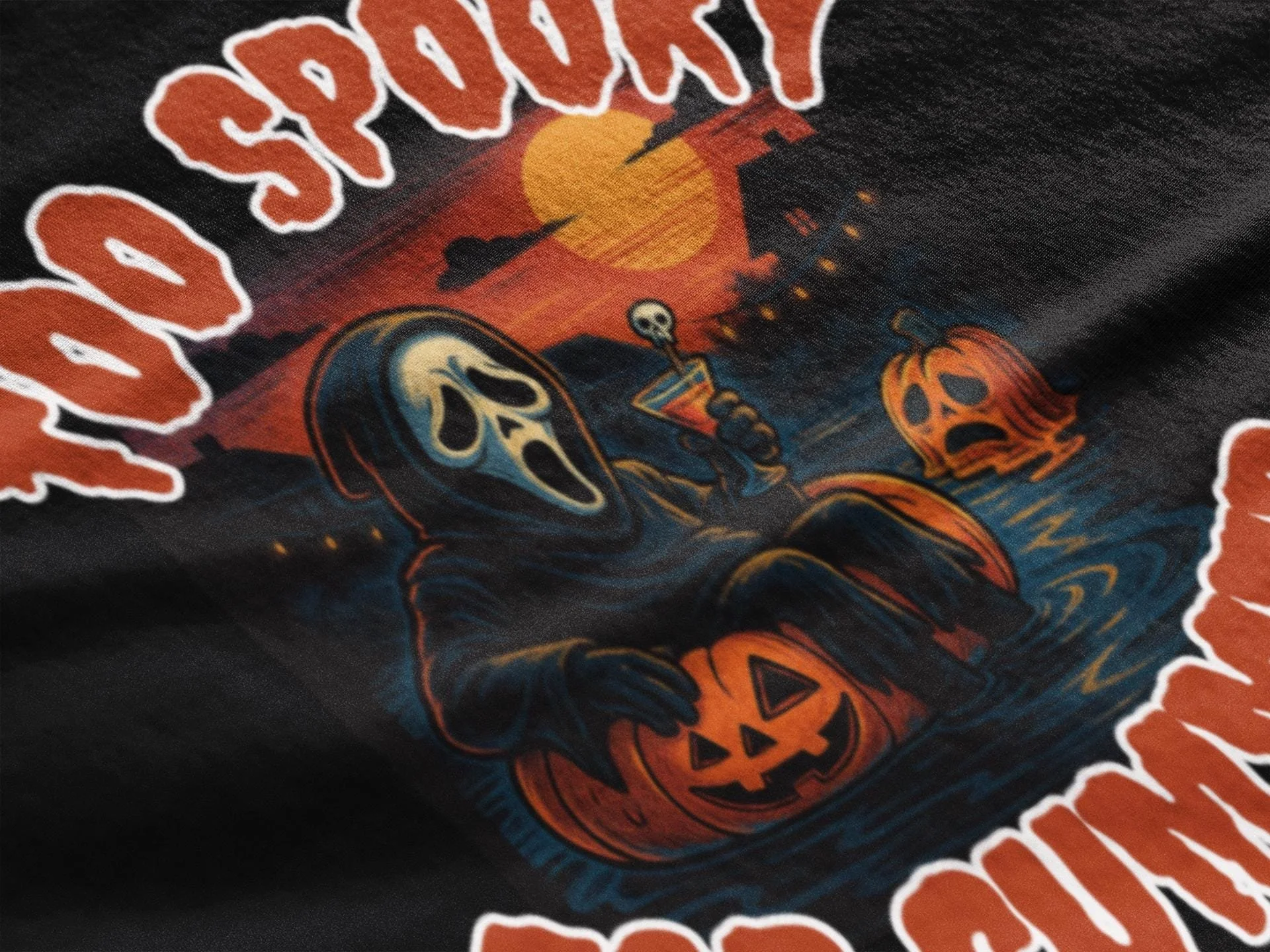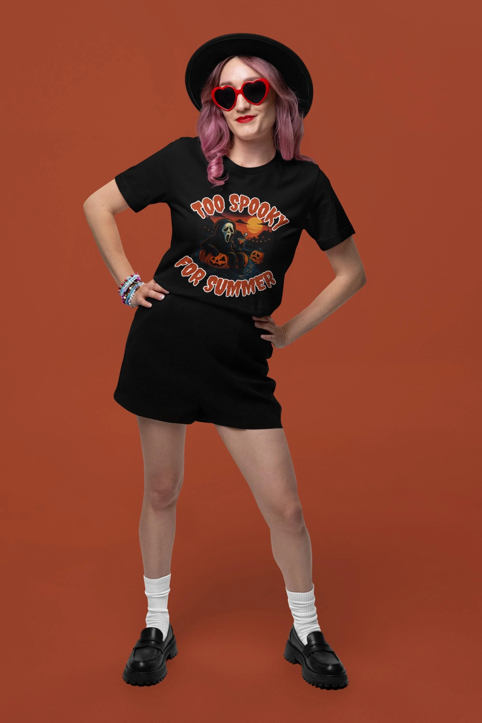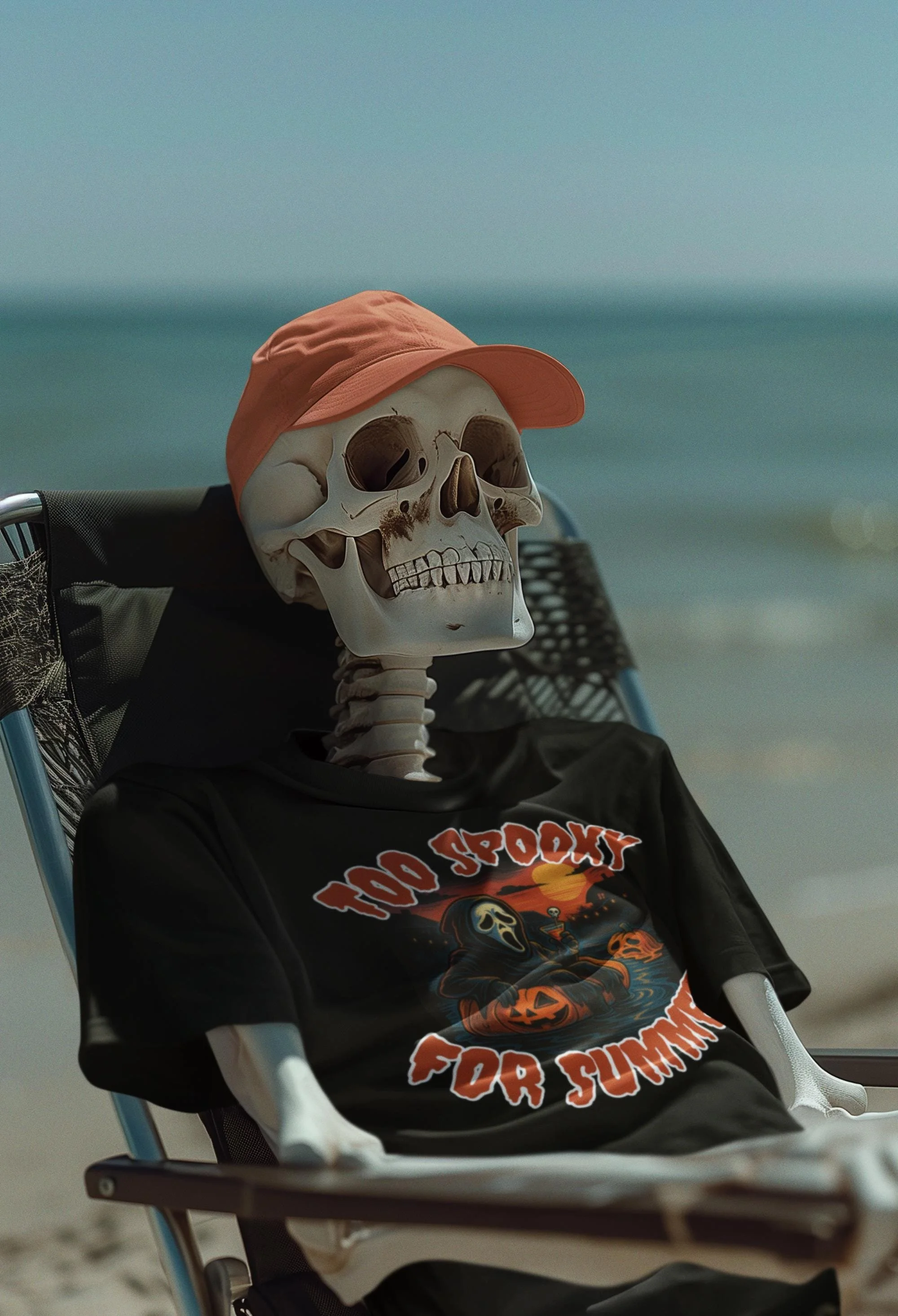 Printed on a comfy black or white tee, this one’s perfect for spooky season lovers, horror movie addicts, and anyone who thinks a pool day would be better with some string lights and a melting pumpkin.