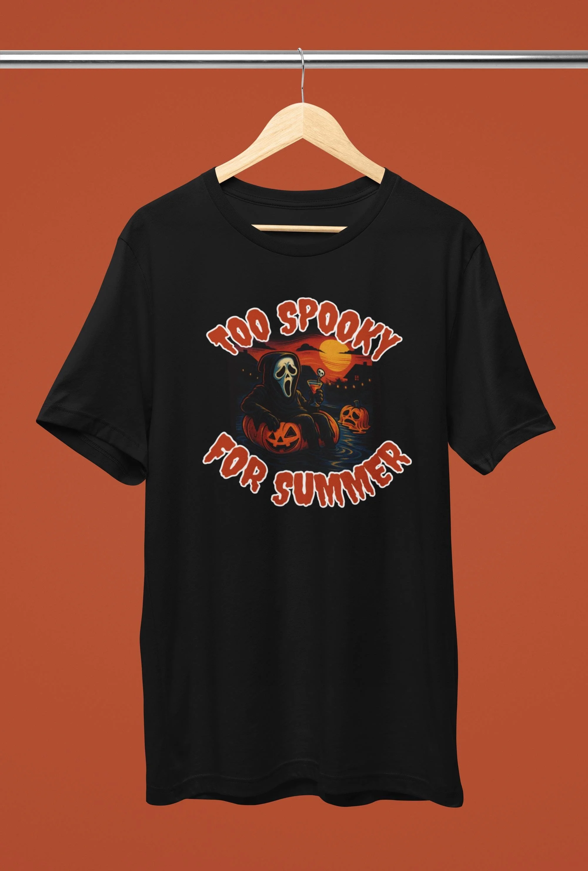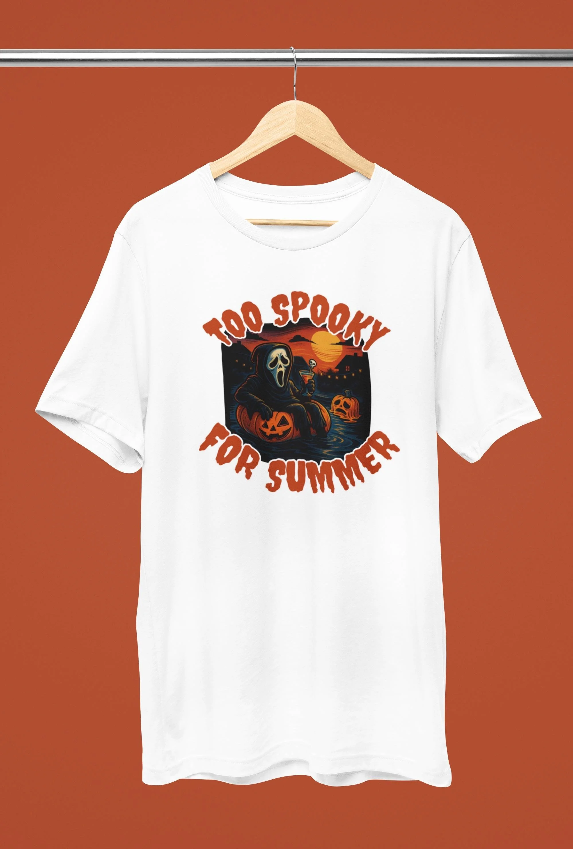 Too spooky for summer. This retro-style horror tee is for the scream queens and slasher fans who wish it was Halloween all year long. Featuring Ghostface in full costume, floating on a jack-o’-lantern pool ring with a cocktail in hand, this design gives off big “I hate summer” energy with an 80s horror movie twist.